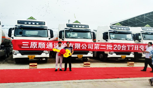 6月25日,重汽銷售部西安分公司攜手4S店西安瑞通汽車貿易有限公司為三原順通運輸有限公司舉行第二批20臺T7H危化品牽引車交車儀式。