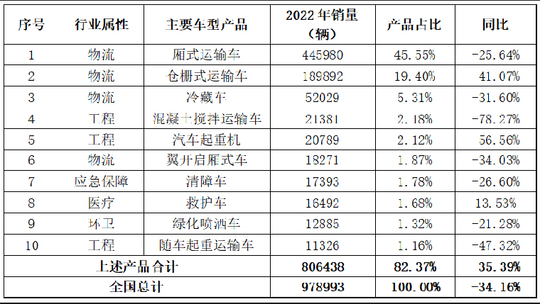 從銷售省份來看廣東、山東、湖北、江蘇、云南是產(chǎn)品主要需求大省,占比近40%,全國31省市、自治區(qū)均出現(xiàn)不同程度下滑,僅上海市同比下滑低于10%。 細(xì)分產(chǎn)品情況 從細(xì)分產(chǎn)品來,2022年需求前十的專用汽車單品依次為:廂式運(yùn)輸車、倉柵式運(yùn)輸車、冷藏車、混凝土攪拌運(yùn)輸車、汽車起重機(jī)、翼開啟廂式車、清障車、救護(hù)車、綠化噴灑車、隨車起重運(yùn)輸車。
