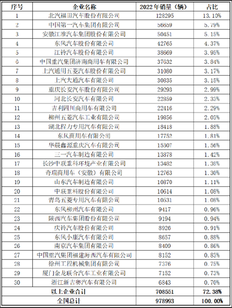 2022年銷量過10萬的企業(yè)僅北汽福田1家,占比13.10%。年銷量過銷量過萬的企業(yè)有21家。