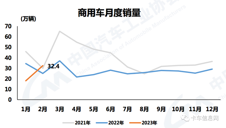 2月份,商用車產(chǎn)銷分別完成31.7萬輛和32.4萬輛,環(huán)比分別增長(zhǎng)61%和79.4%,同比分別增長(zhǎng)13.5%和29.1%。在商用車主要品種中,與上月相比,客車、貨車產(chǎn)銷均呈大幅增長(zhǎng);與上年同期相比,客車、貨車產(chǎn)銷均呈兩位數(shù)明顯增長(zhǎng)。