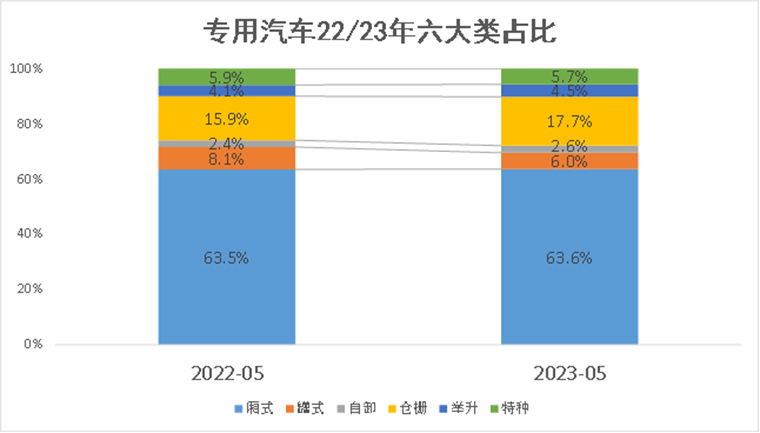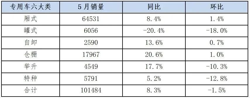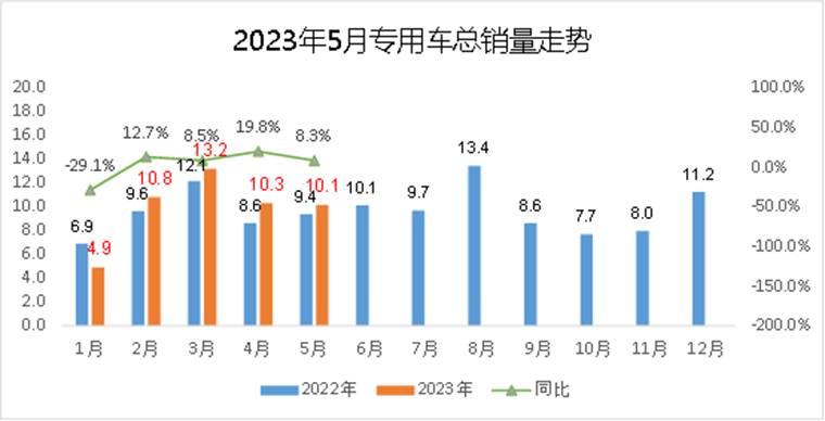 2023年5月份專用汽車企業共計銷售專用汽車(六大類)10.1萬輛,同比上漲8.3%,環比下降1.5%,同期低基數效應消退,增速放緩。