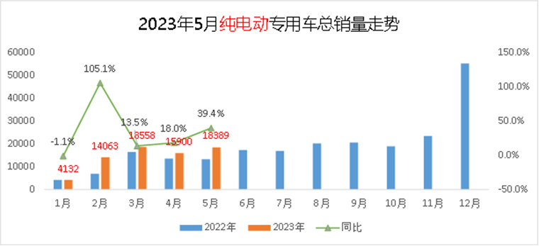 5月份專用汽車企業共計銷售新能源專用汽車18846輛,其中純電動18389輛,同比增長39.4%,環比增長15.7%,保持增長態勢。