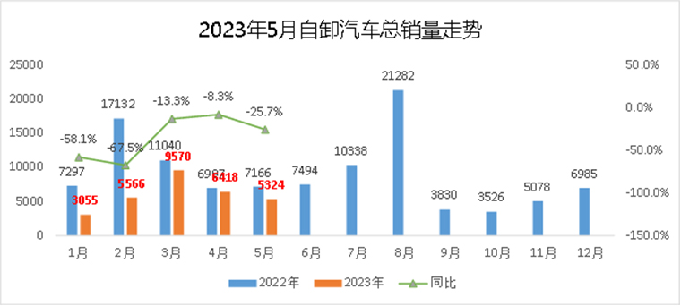 五月份普通自卸車企業共計銷量普通自卸車5324輛,同比降低25.7%,環比降低17.0%,市場表現低迷。