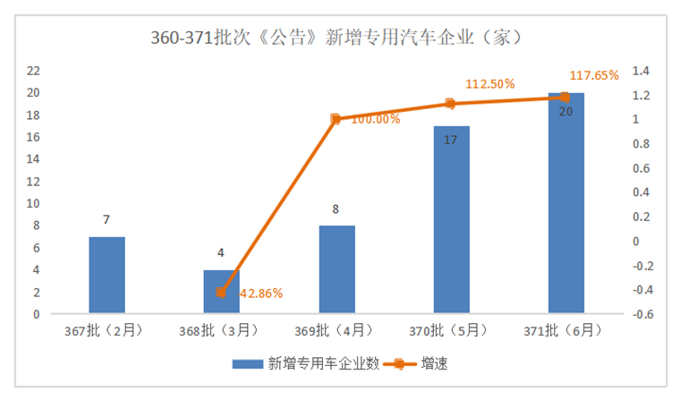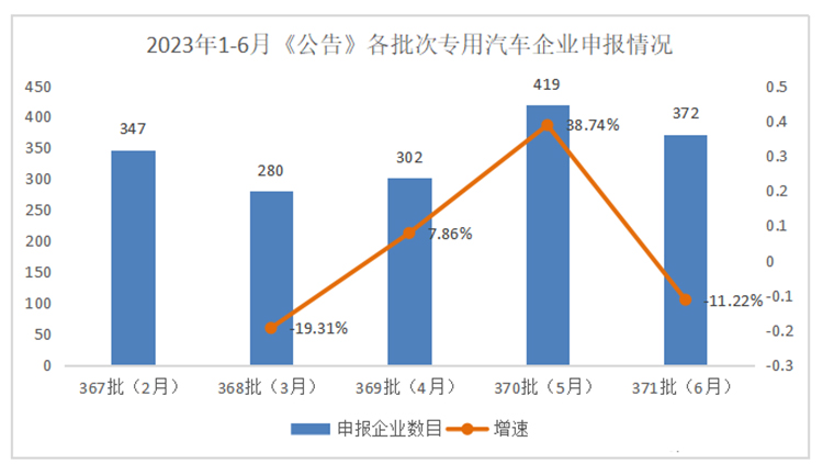 從上半年《公告》申報專用汽車企業數量來看,申報專用汽車新產品企業發展態勢并不穩定,其中最高增幅達38.74%,單批次申報企業數量超過400家,3月第368批最大減幅至19.31%,申報數量低于300家。