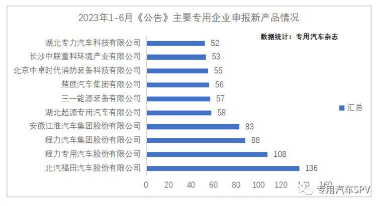 從申報企業來看,專用汽車新產品在120個以上的僅北汽福田一家企業,生產了136個新產品。