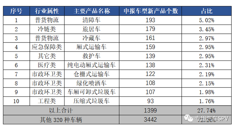 從車型來看,申報新產品數量超過150個的車型主要有市政環衛類和普貨物流類兩種,共申報新產品數量為1492個,占比30.82%。
