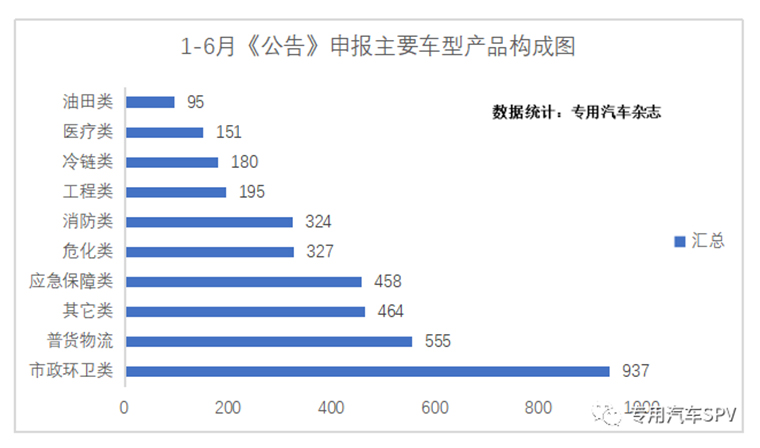 從專用車申報產品來看,1-6月《公告》中共申請330種車輛,其中150個以上的有4種,即清障車、旅居車、冷藏車、廂式運輸車,其中清障車申報最為火熱。