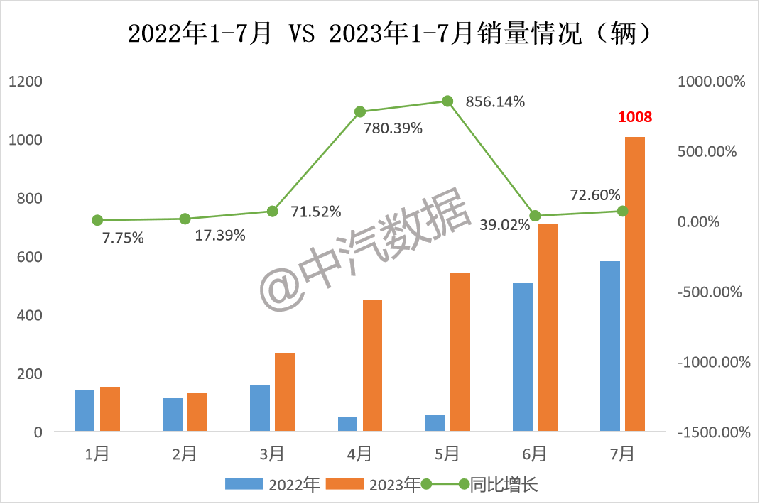 2023年1-7月,除2月銷量略有下降,總體銷量呈快速增長態(tài)勢,且相較2022年同期,各月份均實現(xiàn)不同程度的增長。