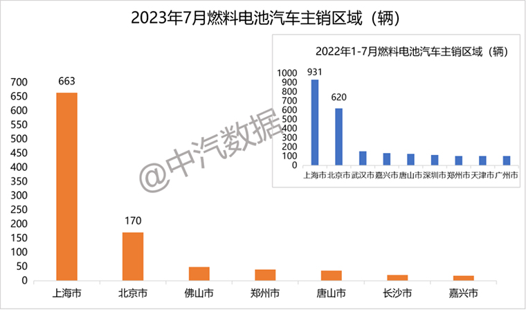 從銷售區(qū)域來看,2023年7月,上海是國內燃料電池汽車市場的熱銷區(qū)域。以663輛的月銷量獨占鰲頭,占7月總銷量的65.8。 雖然7月基本保持和上半年相近的趨勢,以上海、北京、佛山等示范城市為主,但長沙、嘉興等非示范城市也在積極發(fā)力,推進燃料電池市場化進程。