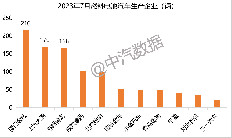 從燃料電池整車企業(yè)競爭格局來看,2023年7月,燃料電池汽車生產企業(yè)市場集中度較高,銷量前三位的廈門金旅、上汽大通和蘇州金龍銷量分別為216輛、170輛和166輛,占7月總銷量的54.8%。但燃料電池汽車企業(yè)競爭格局仍處于動態(tài)變化中。