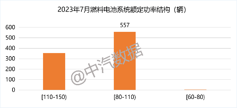 從燃料電池系統(tǒng)來看,燃料電池系統(tǒng)仍趨于大功率化,2023年7月,燃料電池系統(tǒng)額定功率以80-110kW為主,銷量配套量為557輛,占比超過7月全部系統(tǒng)配套量的一半。